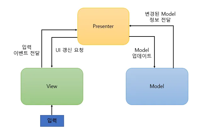 UI 로직과 비즈니스 로직을 분리해 View와 Model 간 결합도를 낮추며 MVC의 문제점을 해결했으나, View와 Presenter 간 의존성이 남아있다는 문제가 남아있습니다.