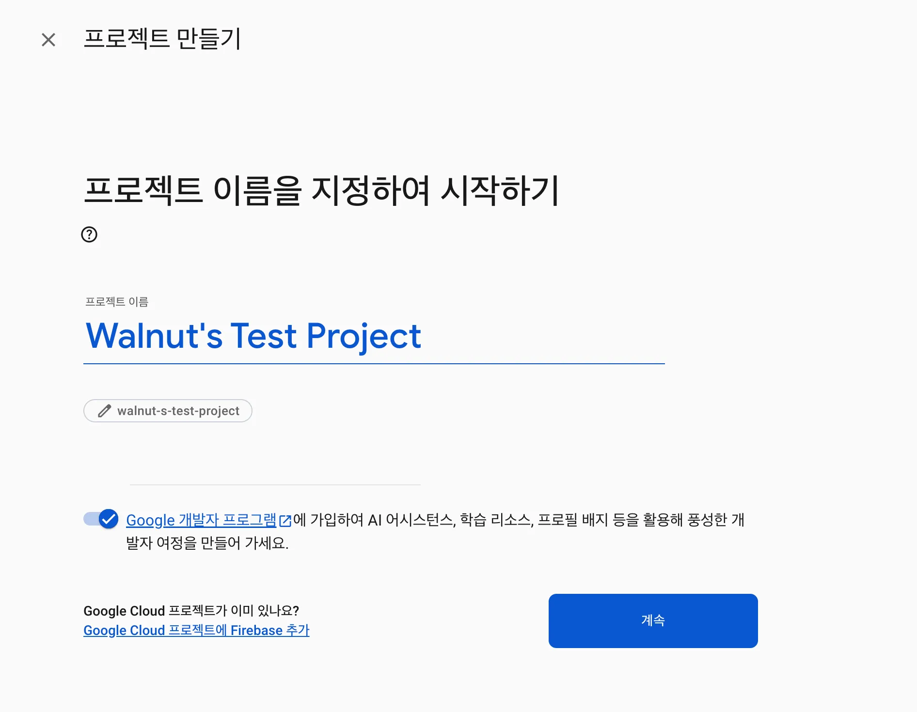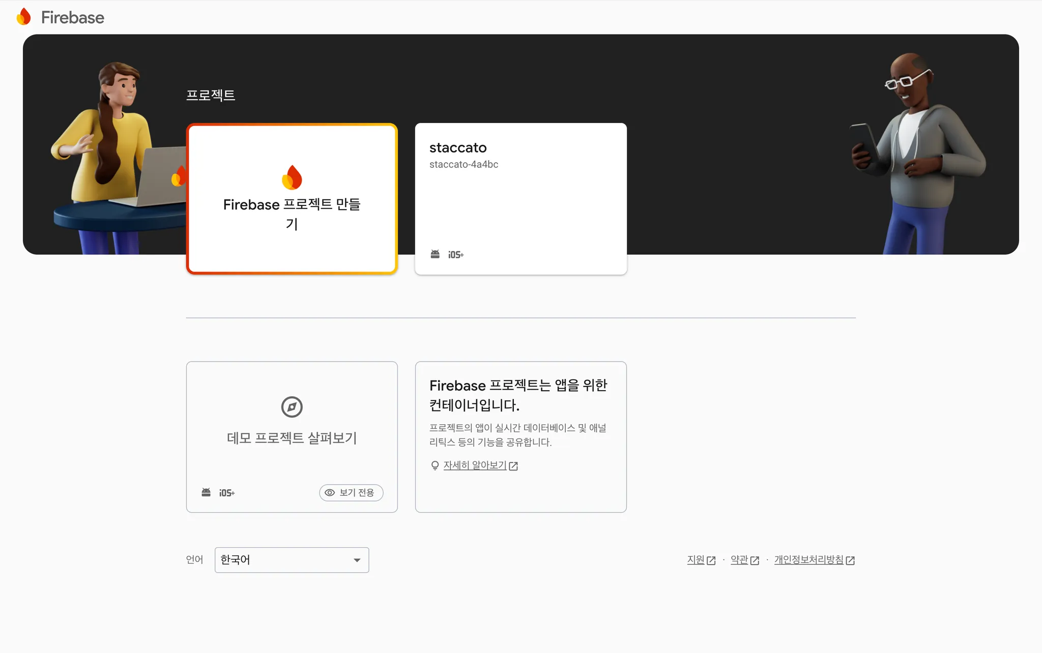 우선 Firebase 프로젝트가 없다면 프로젝트를 새로 만들어야 합니다. 앱을 추가하기 위해 만들어둔 Firebase 프로젝트가 있다면 해당 단계는 건너뛰어도 좋습니다.
