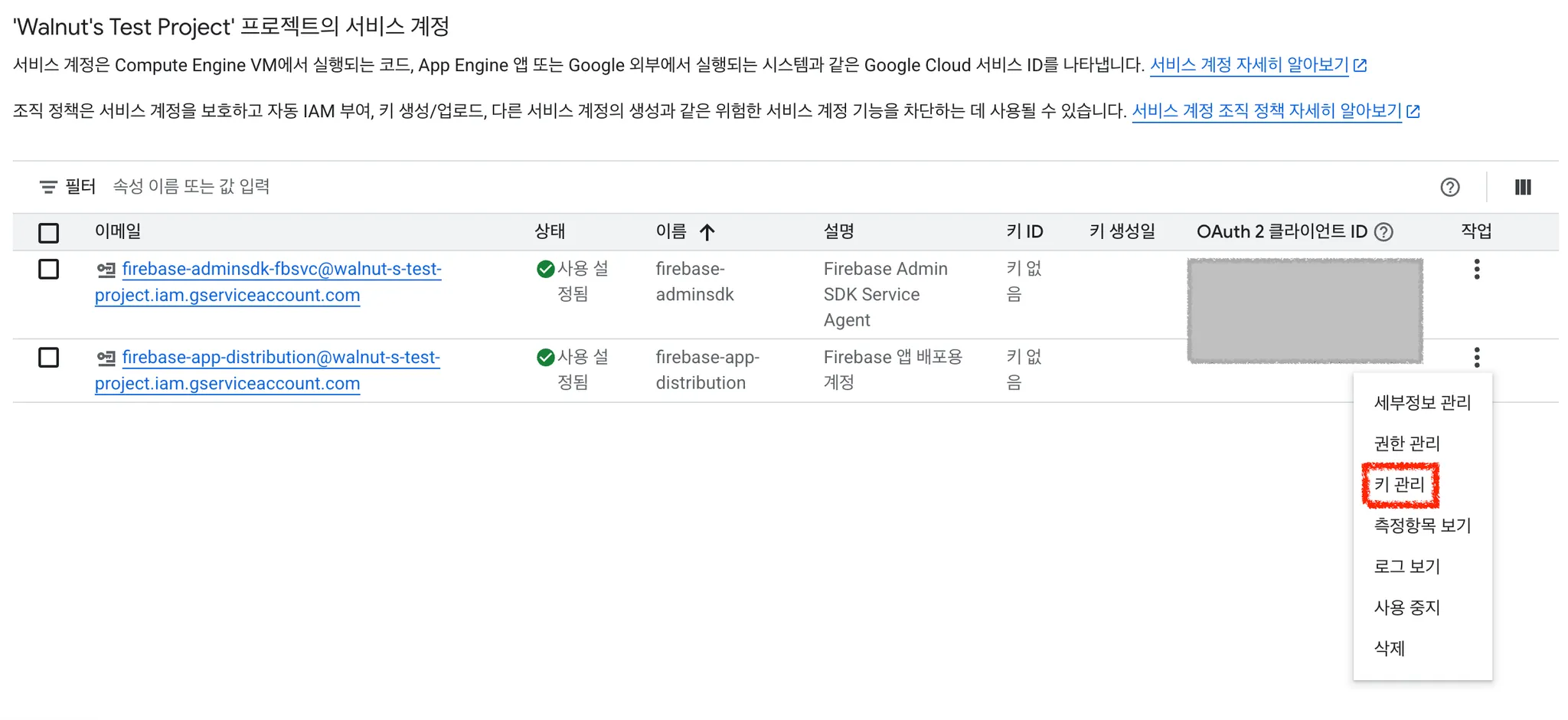 생성한 서비스 계정의 “키 관리” 설정을 클릭합니다.
