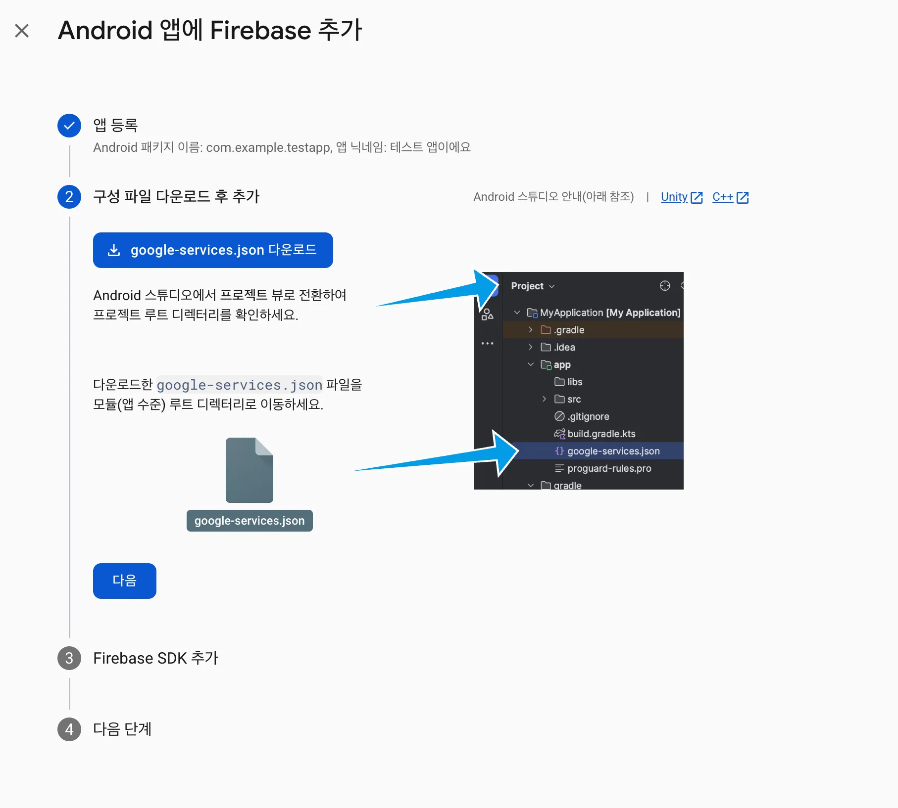 - 구성 파일인 google-services.json 파일을 다운로드한 뒤, 프로젝트의 루트 경로에 추가합니다.