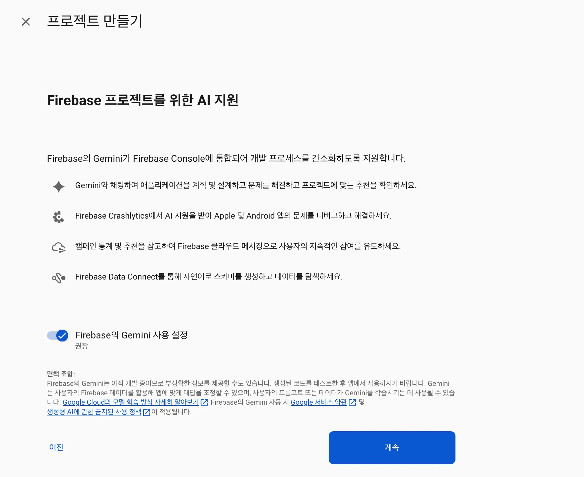 - (선택) Gemini와 애널리틱스 사용을 설정합니다. 필수는 아니므로 필요하신 분들만 설정하셔도 좋습니다.