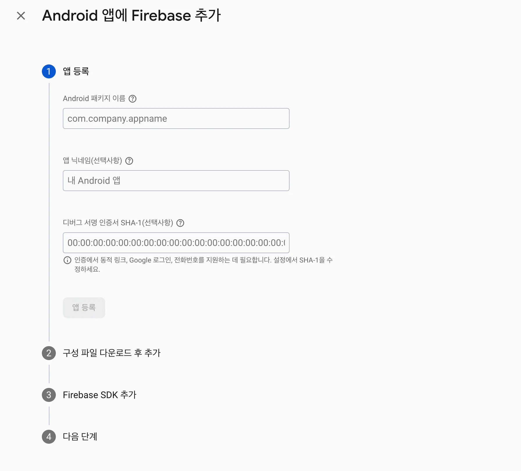 - 닉네임은 자유롭게 설정하시면 되고, 서명 인증서 SHA-1의 경우 나중에 필요할 때(Google 로그인, 딥링크 사용 등) 따로 설정할 수 있으므로 지금은 넘어가셔도 좋습니다.
