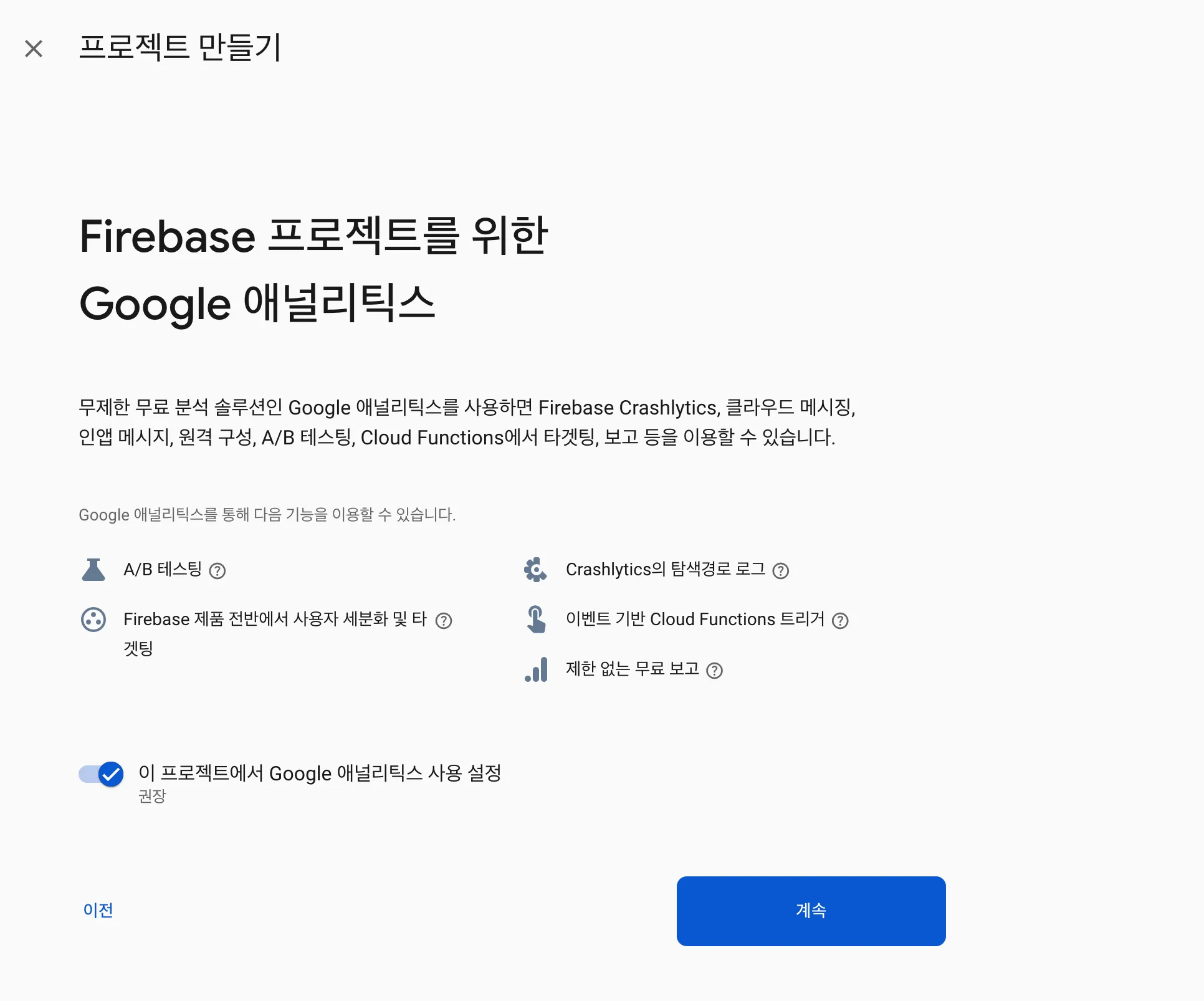 - (애널리틱스를 사용 설정한 경우) 애널리틱스 구성 설정입니다. 계정을 만들고 위치 설정, 약관 동의가 필요합니다.
