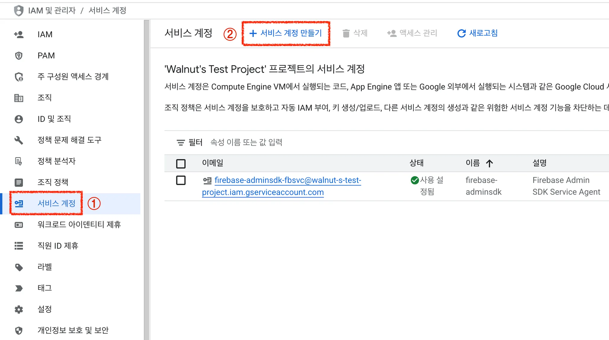 - “서비스 계정” 메뉴로 이동하여 “서비스 계정 만들기”를 클릭합니다.