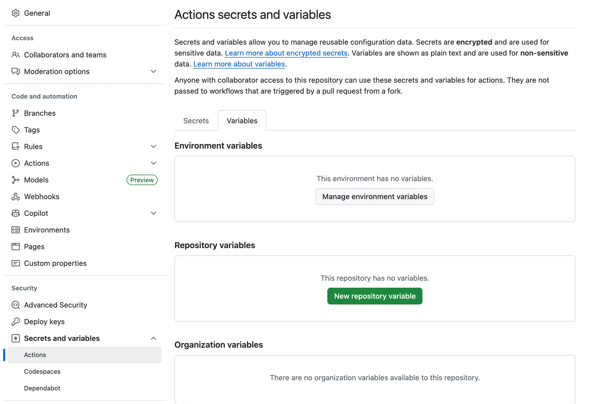 - GitHub 레포지토리의 Settings > Secrets and variables > Variables 로 이동합니다.