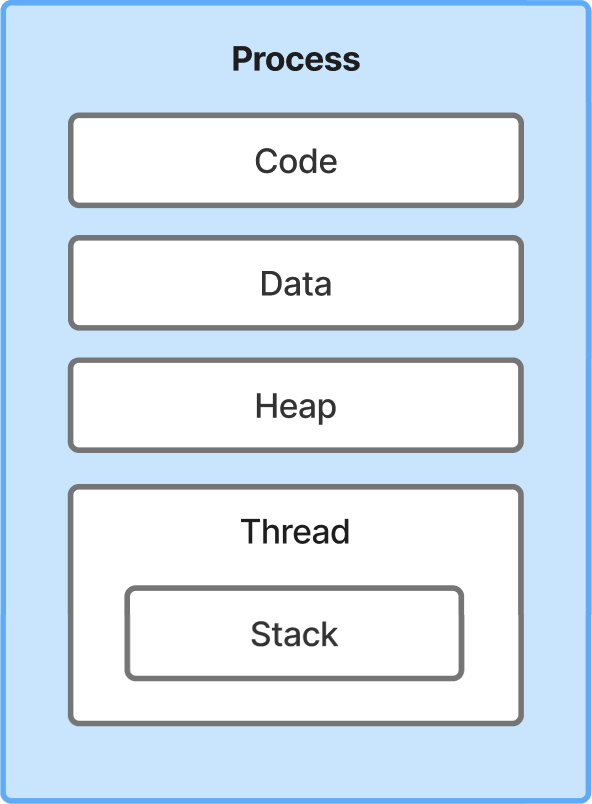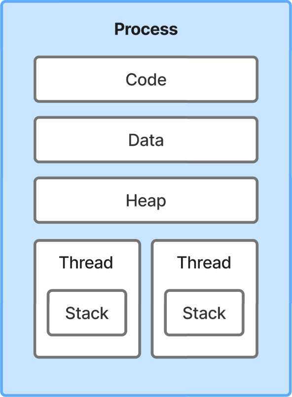 스레드는 프로세스 안에서 실행하는 기본적인 작업 단위입니다. 이 작업은 하나일 수도 있고, 여러 개가 될 수도 있습니다. 또한 동일 프로세스 안에서 실행되는 스레드는 프로세스의 데이터, 힙 메모리 공간을 공유하기 때문에 공유 자원에 접근할 수 있습니다.