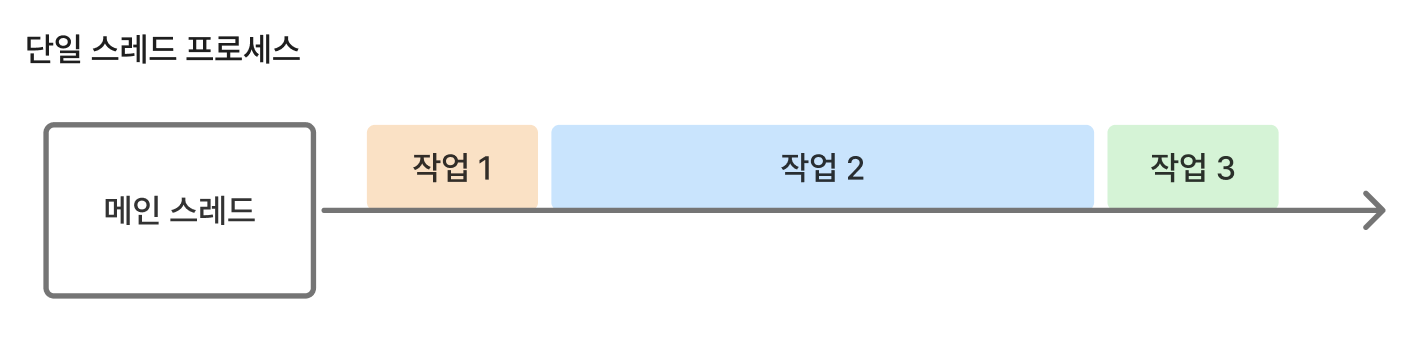앞서 스레드는 하나의 작업을 수행할 때 다른 작업을 동시에 수행하지 못한다고 설명했습니다. 스레드에서 하나의 작업을 수행 중이라면, 해당 작업이 처리되는 동안 스레드는 다른 작업을 수행하지 못합니다. 이를 스레드의 점유라고 부릅니다. 그래서 만약 메인 스레드에서만 작업을 처리하는 단일 스레드 프로세스가 오래 걸리는 작업을 하고 있다면, 그동안 다른 작업들은 그 작업이 끝날 때까지 대기해야합니다.