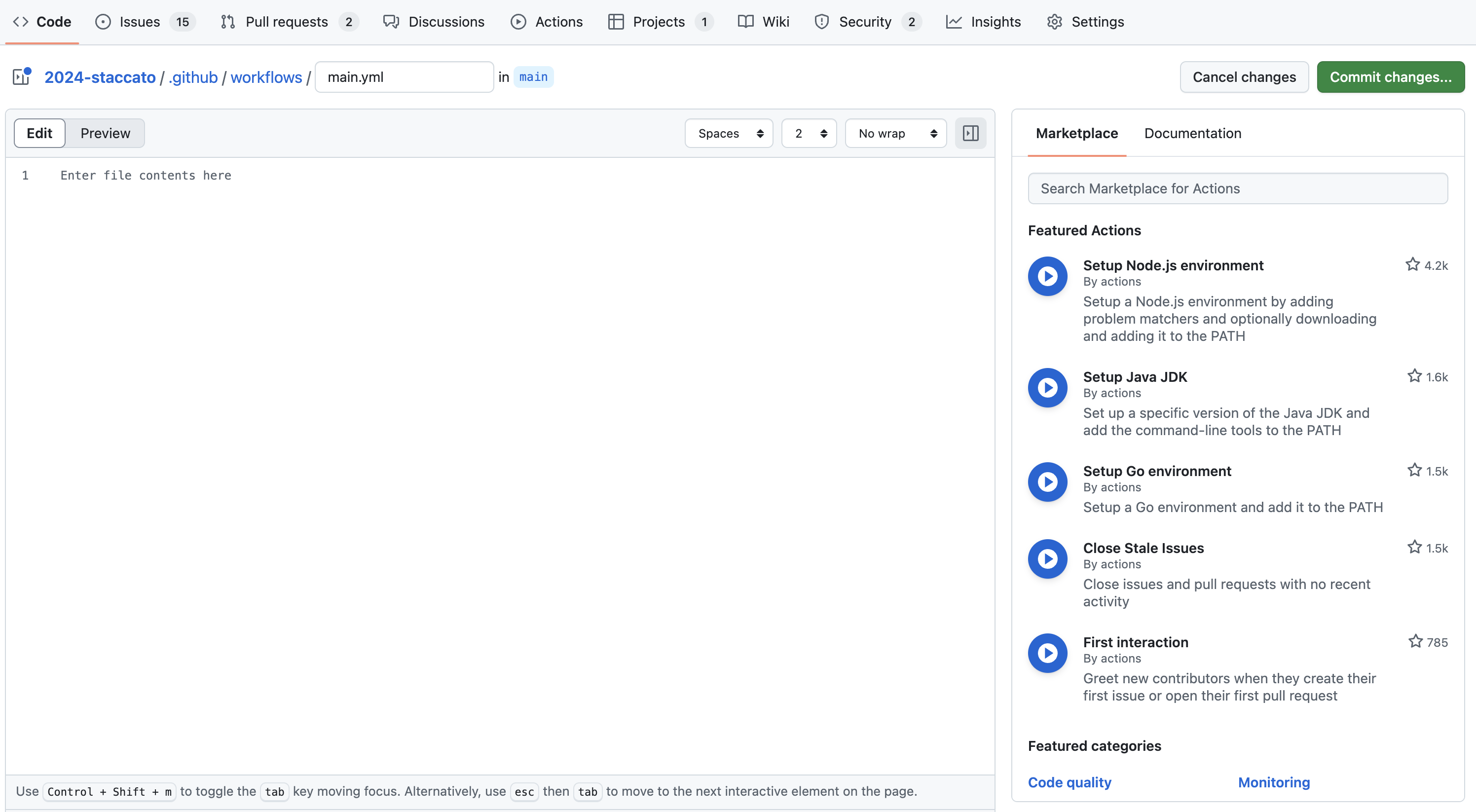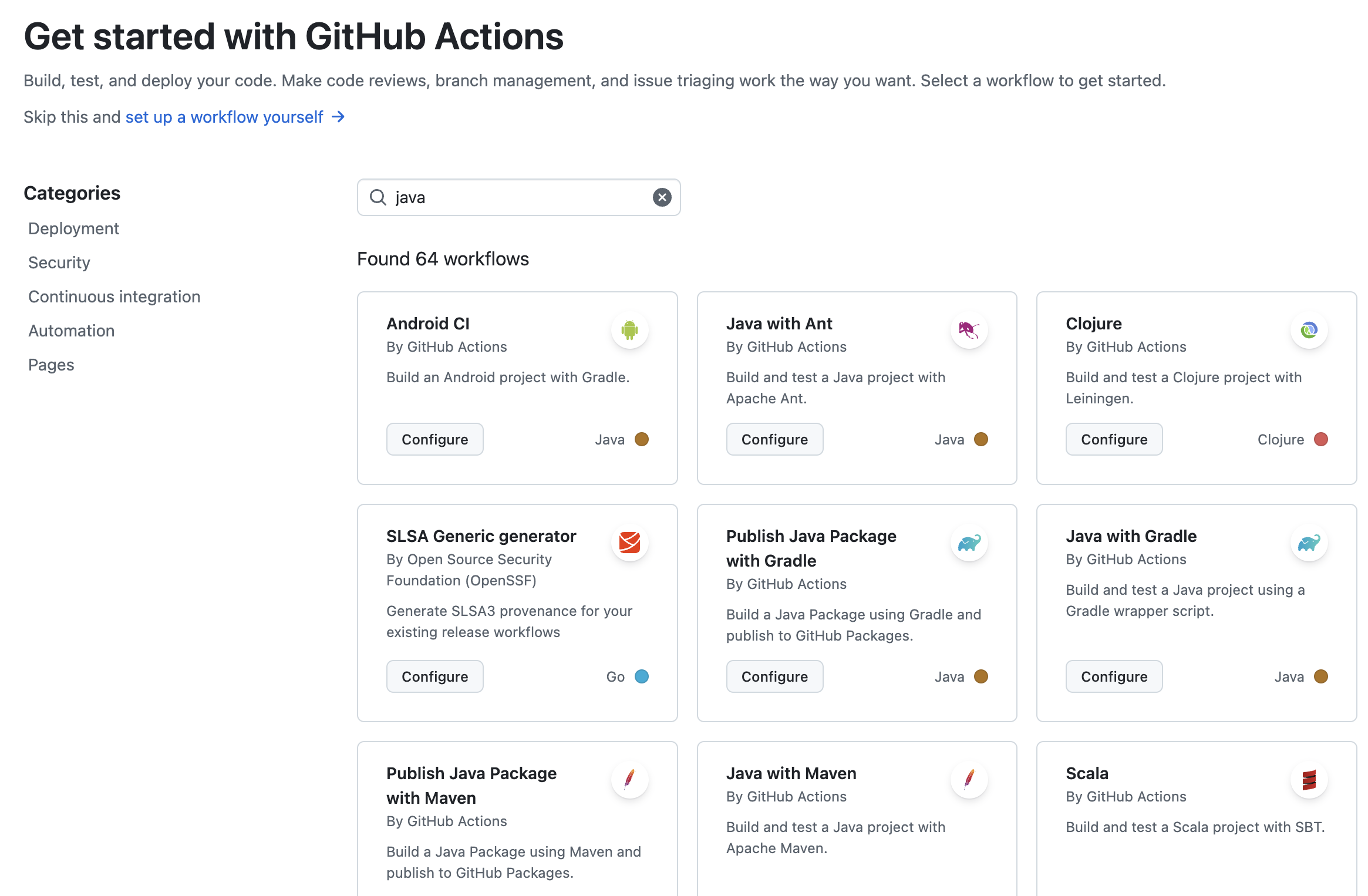 이곳에서 원하는 키워드를 검색하여 원하는 워크플로를 빠르게 시작할 수 있습니다. 물론 기본적인 설정만 작성되어있고, 프로젝트 환경에 따라 커스텀하게 변경해주어야합니다.